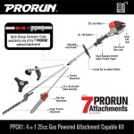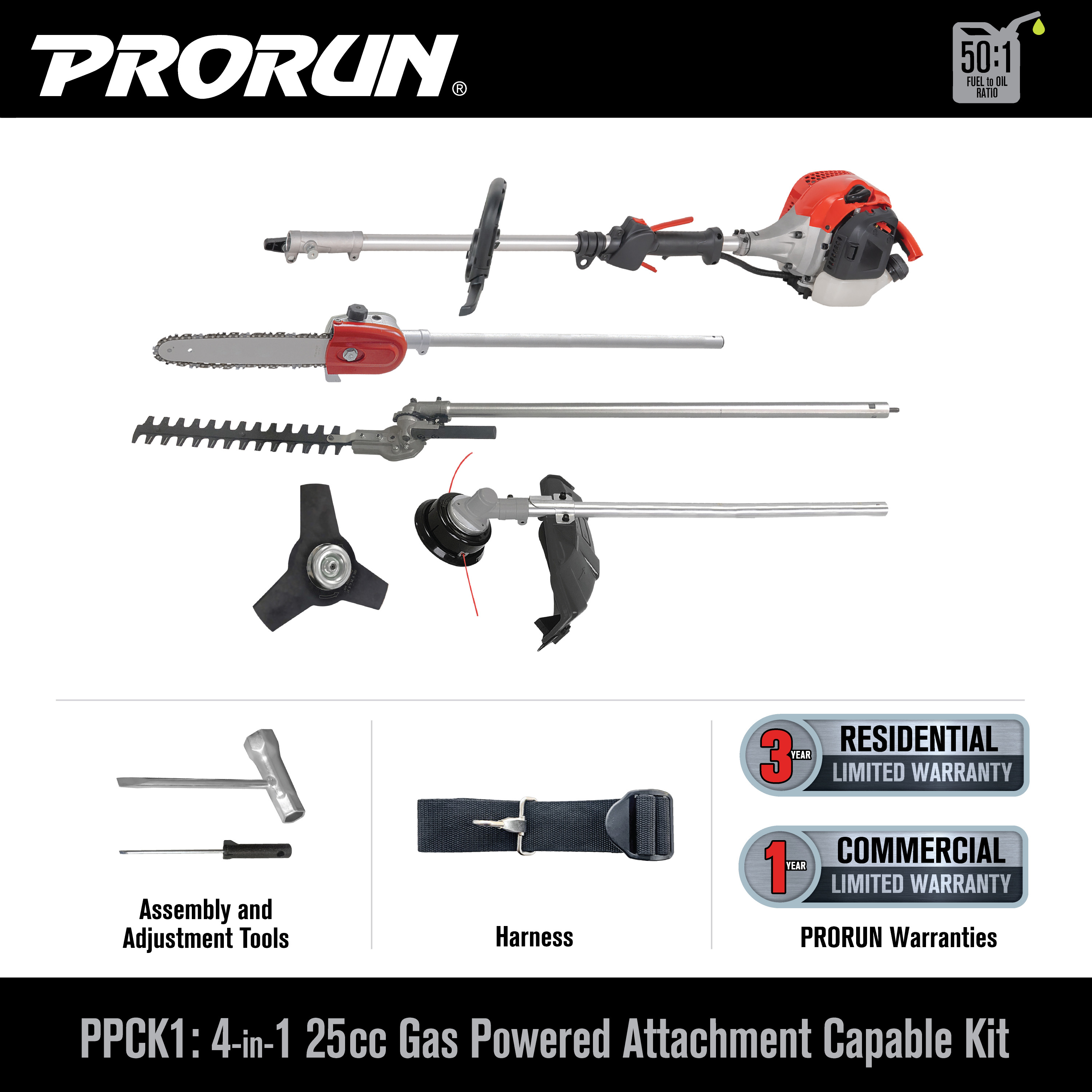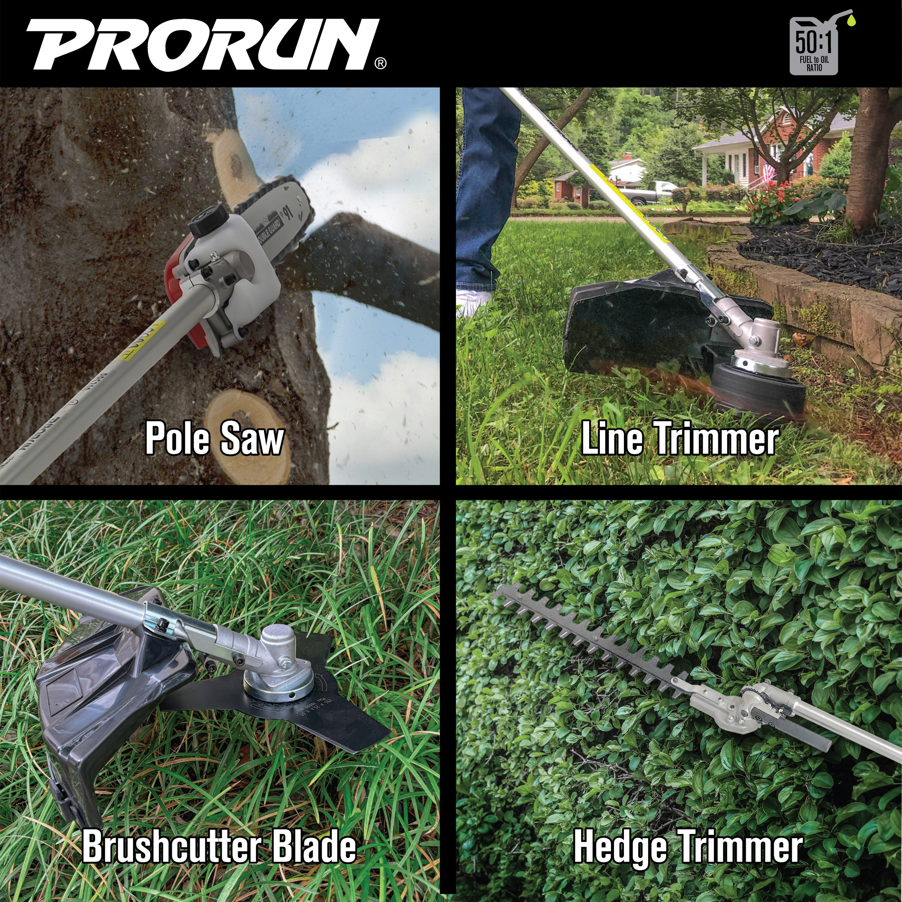 Take on tough yard work with the PRORUN 4-in-1 Multi-Tool System—your all-in-one solution for efficient, powerful, and versatile lawn care. This convenient tool combines a string trimmer, brush cutter, pole saw, and hedge trimmer, so you can easily handle everything from everyday grass trimming to high-reach pruning. Equipped with a robust motor, the PRORUN delivers consistent power to slice through thick brush, long grass, stubborn tree limbs, and overgrown hedges. The pole saw lets you access tall branches and hedges with ease, making your work safer and less physically demanding. Thanks to the quick-connect attachment system, swapping tools takes just seconds—no tools, no hassle, no downtime. Move from trimming to cutting to pruning without skipping a beat. Built for comfort and durability, this tool features an ergonomic grip for better control and handling, and rugged construction that’s made to withstand heavy use season after season.
