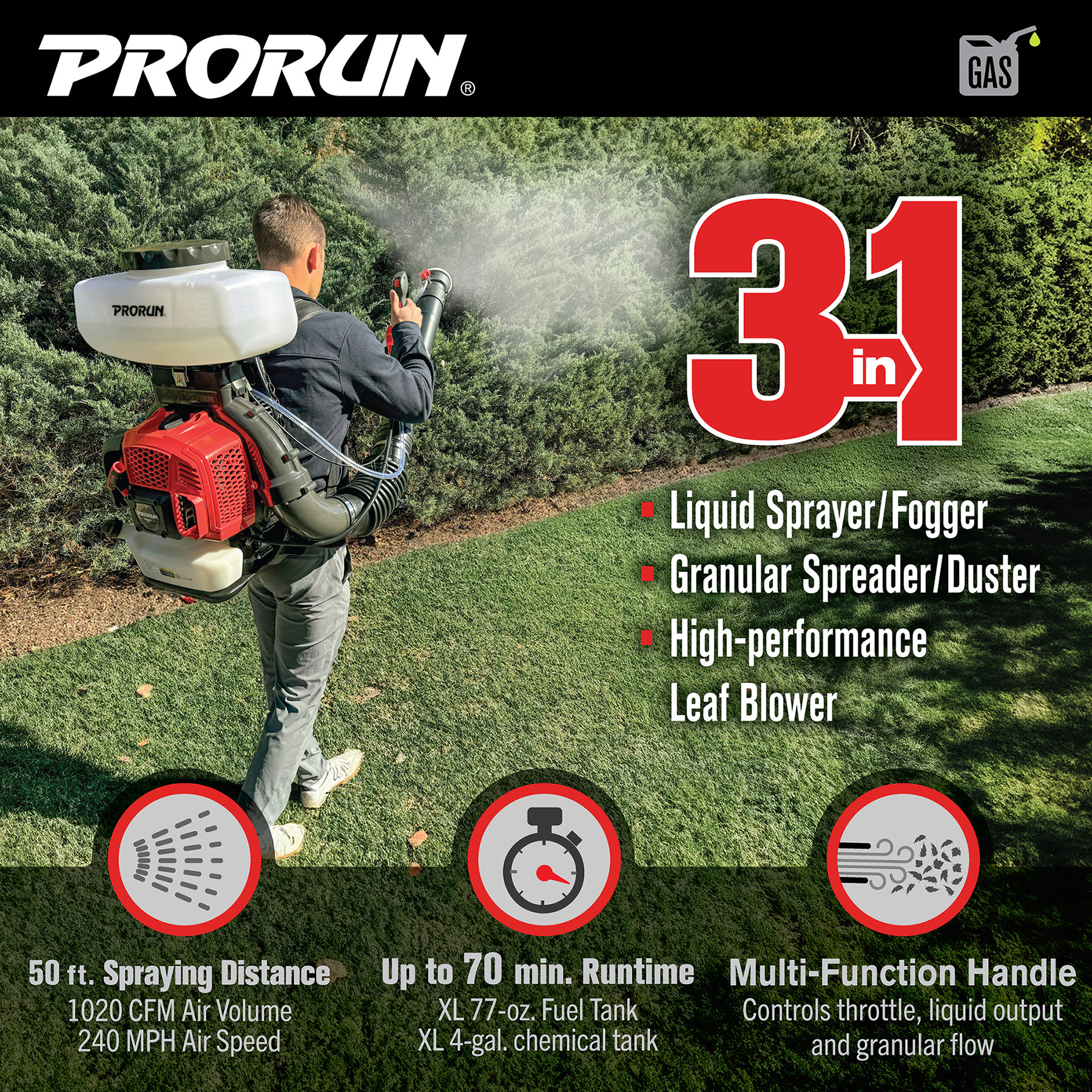 Push button spray options with variable speed trigger and cruise control. Large 4-gallon capacity tank features an oversized opening for easy filling and cleaning of spray compounds. 2-in-1 conversion switch easily shifts from spraying to dusting at the turn of a handle, with no need for a separate conversion kit or specialized skills. Three fitted nozzles provide customized jets for any application: Deflector Screen Nozzle alters the shape and direction of the spray, Fan Jet Baffle Screen Nozzle softens and broadens the spray, and 45° Deflector Screen Nozzle targets the spray for treatment under leaves. Provides up to 70 minutes of use at full throttle on a full fuel tank. Backed by PRORUN Limited 3-Year Residential Warranty and guaranteed to deliver results for years to come.